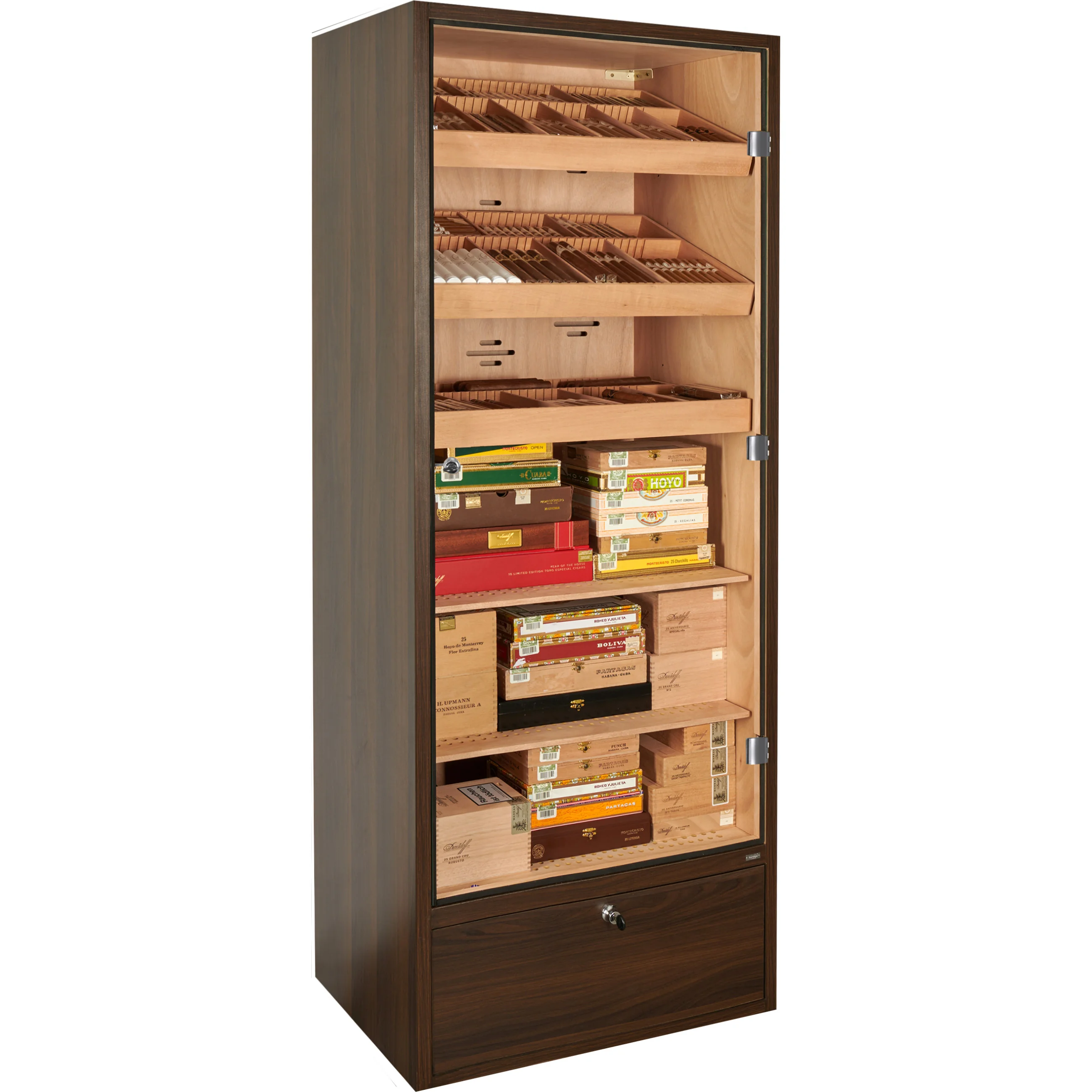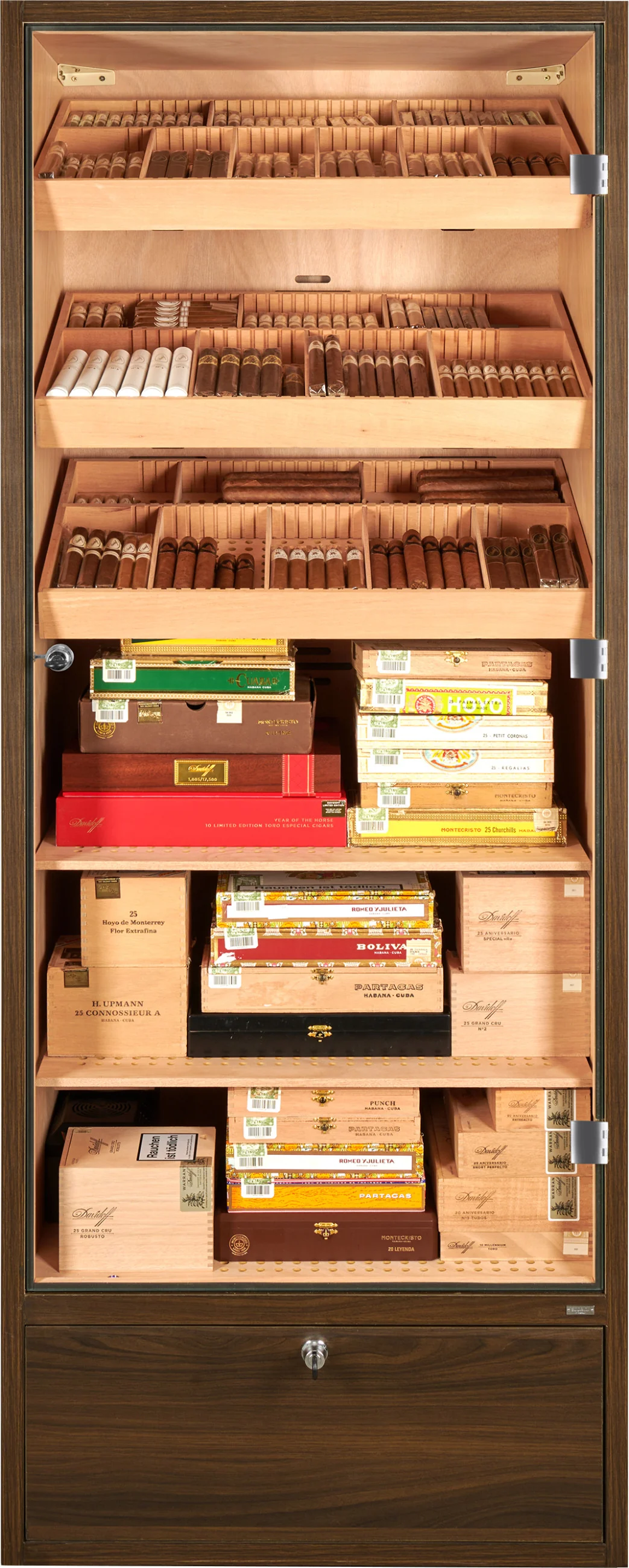 The base of the humidor cabinet contains a lockable drawer that can be used for storing cigars as well as accessories or consumables such as distilled water. The drawer bottom is perforated and separated from the interior, allowing humidity to circulate and ensuring safe cigar storage.
