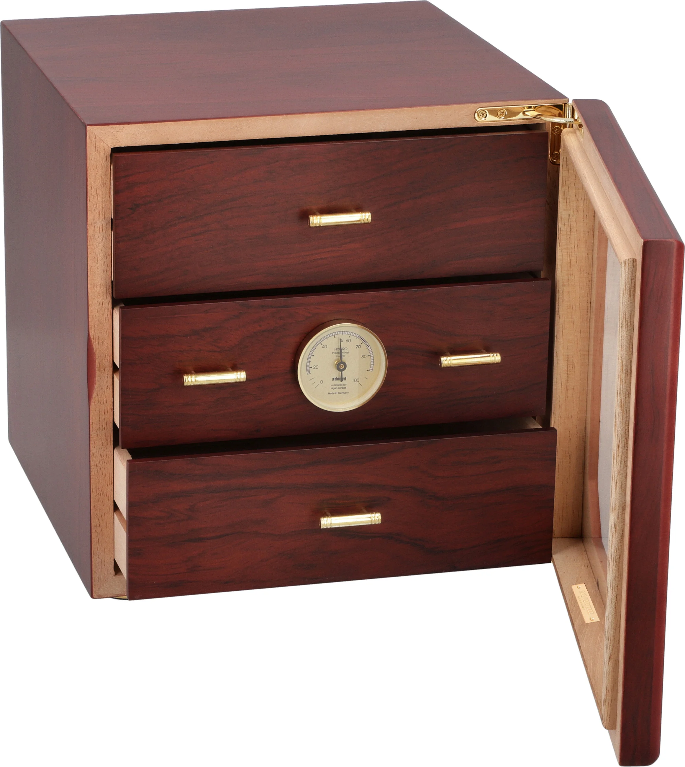 With the unique cabinet-style design and appealingly dark reddish-brown hues of a rosewood finish, the Chianti Medium Deluxe humidor is ideal for those wanting to get away from overly plain boxes colored a boring black. The conspicuous creation features gold-plated accents and a front-opening door with glass viewing pane, which makes an eye-catching centerpiece for any room or office. The steamed Spanish Cedar interior features three sliding cedar drawers with adorini’s RibTech ventilation ribs, which help to enhance the airflow around your cigars. Adding to the flexibility the humidor offers is yet another of adorini’s innovations, a drawer divider system with label clips that allows you to separate and better organize your cigars.