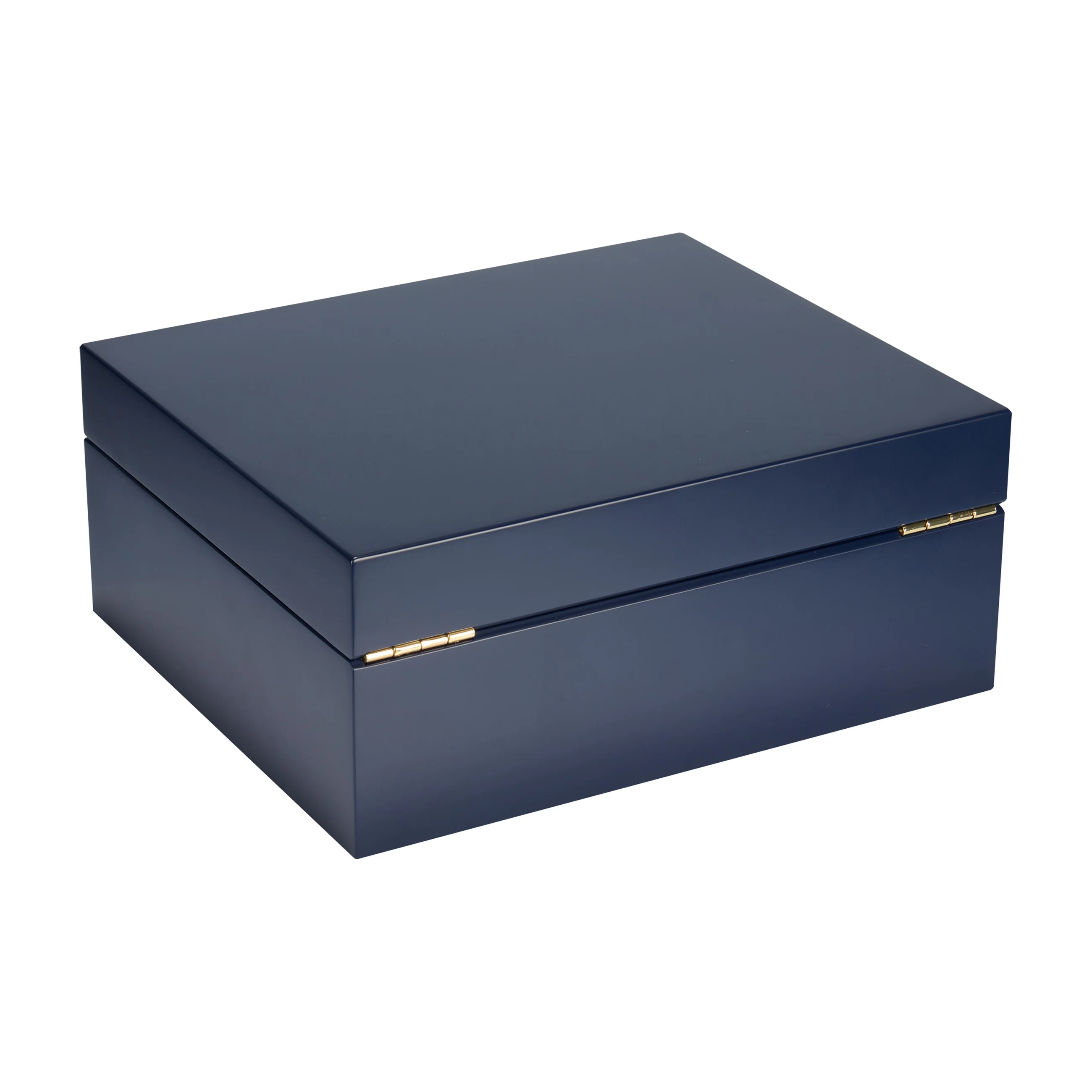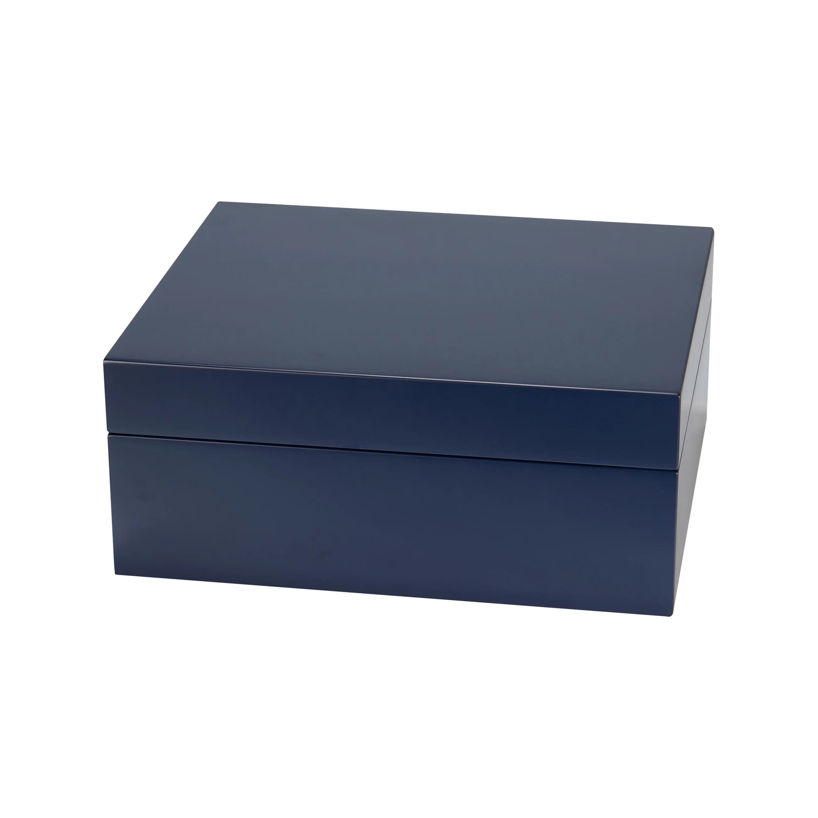 The adorini Humidor Medium Deluxe Midnight Blue is part of the new adorini collection in four exciting color variations. This model impresses with a sophisticated, timeless dark blue, enhanced by gold elements on the interior. Particularly noteworthy is the matte blue soft-touch finish, which extends beyond the outer edge and is thus also visible on the interior. This gives the humidor a harmonious and elegant overall effect.