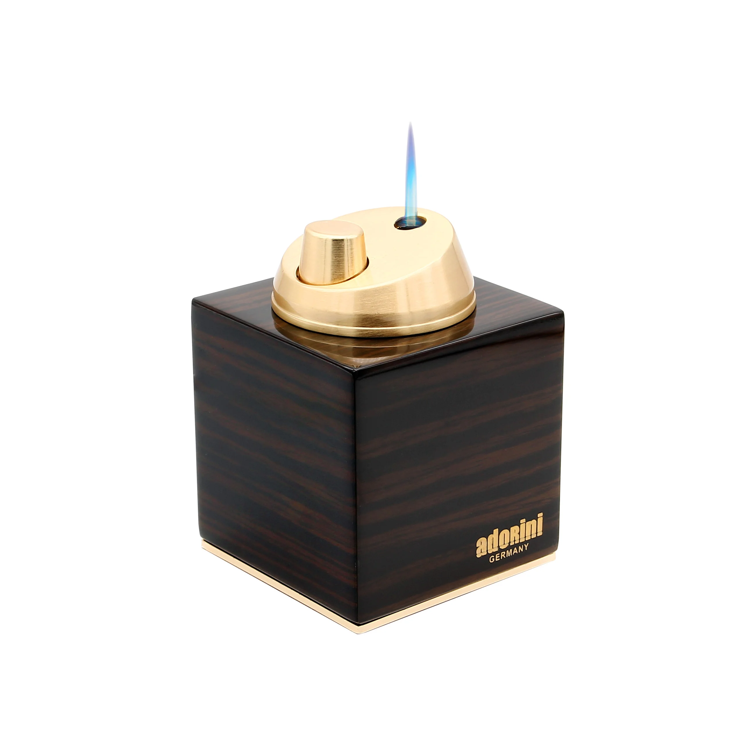 This elegant adorini table lighter with jet flame combines sophisticated design with high-quality functionality. The lighter body made of high-gloss lacquered ebony ensures an impressive presence, which is perfectly accentuated by the golden ignition and the golden decorative edge at the base.