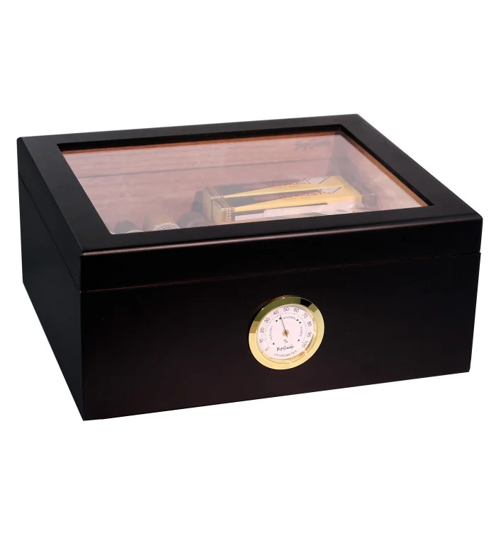 BigSmoke Humidor Medium black with glass lid The elegant humidor from BigSmoke offers enough space for your valuable treasures with an estimated capacity of around 50 cigars. Even smaller cigar boxes can easily find their place. The elegant matte finish of the humidor is complemented by a glass lid that allows a view of the interior without having to open the humidor. An analog hygrometer based on a metal spiral is embedded in the front and is easy to read at all times. The included rod humidifier works on the basis of acrylic polymer crystals and ensures a constant humidity level. A vertical divider enables flexible subdivision and organization of the interior. To protect the furniture on which the humidor is placed, the base is covered with felt.