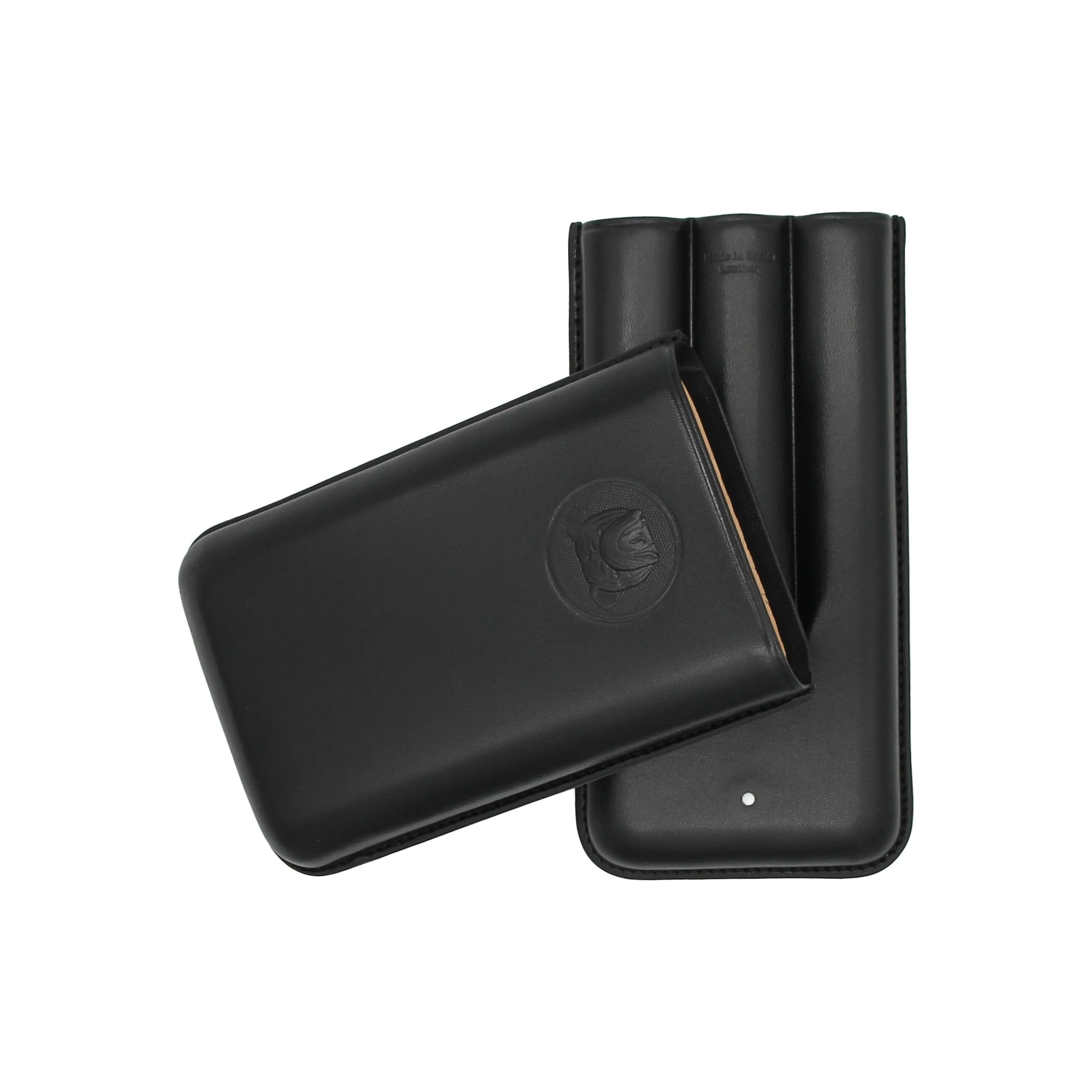 Inside, the case offers space for three cigars of different sizes. Practical notches ensure a secure hold during transport. The interior is lined with soft, light-colored leather, providing reliable protection for your cigars.