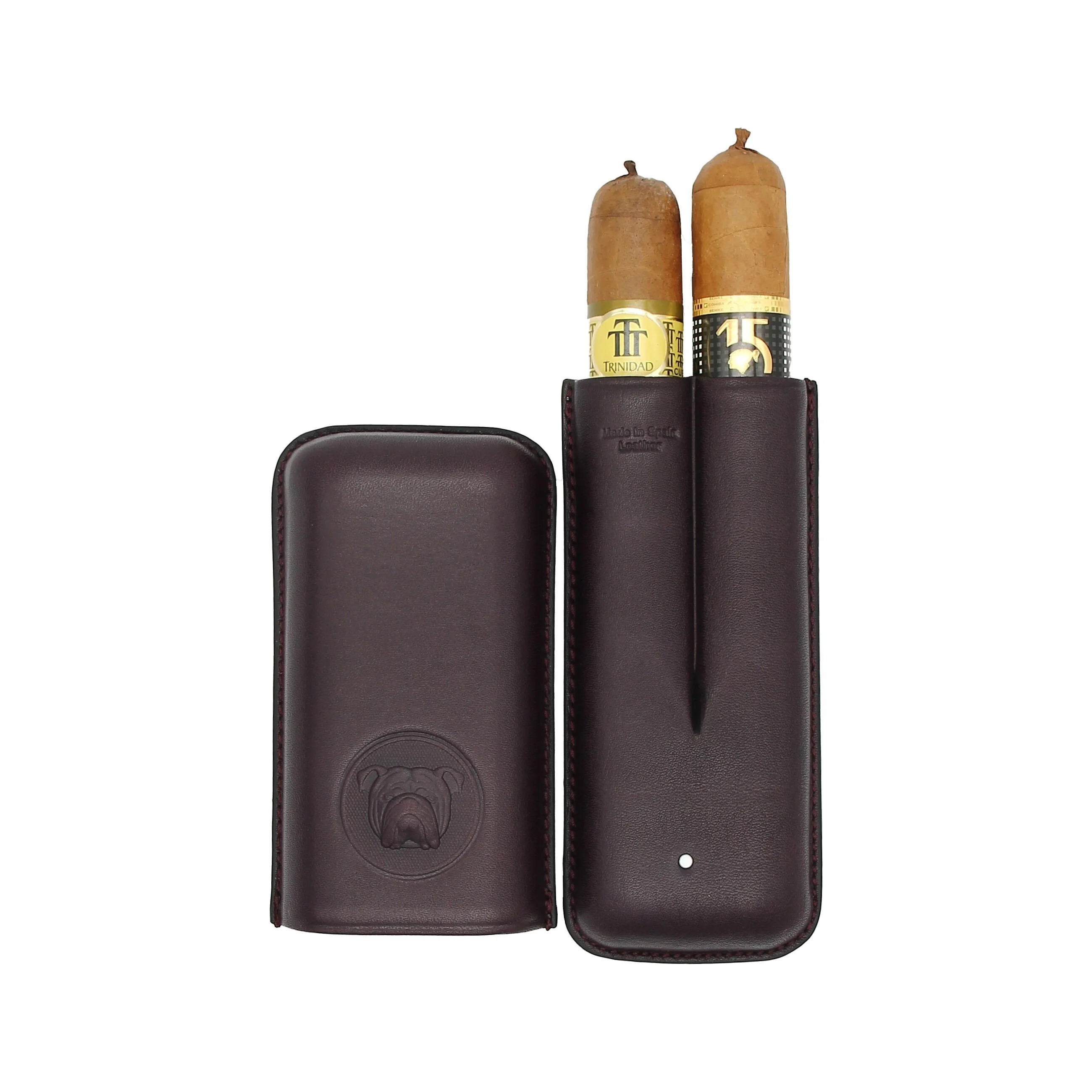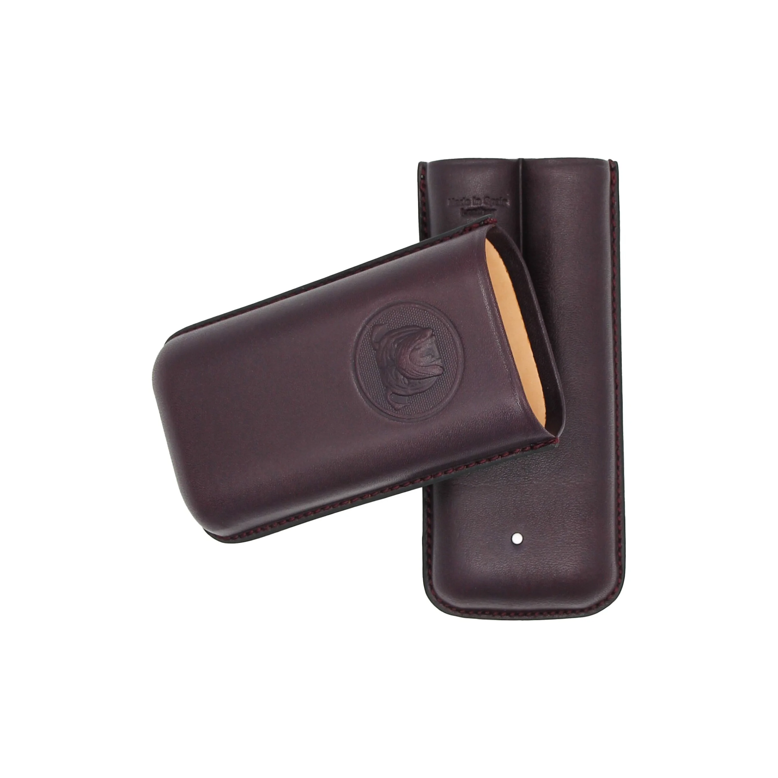 Inside, the case offers space for two cigars of different sizes. Practical notches ensure a secure hold during transport. The interior is lined with soft, light-colored leather, providing reliable protection for your cigars.