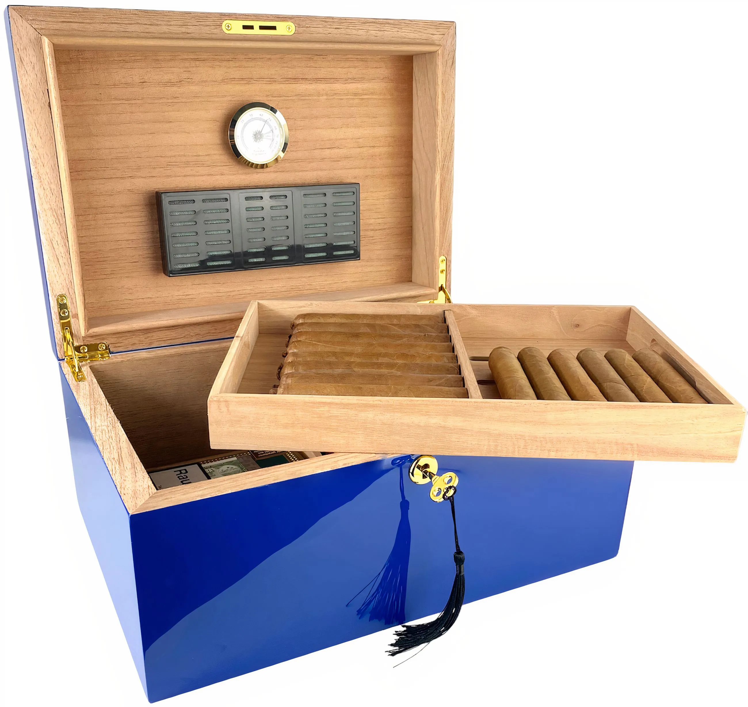 The "Cigar Humidor Blue with Cuban Flag for 100 Cigars" is a perfect symbiosis of functionality and elegance that will captivate both seasoned cigar connoisseurs and collectors. Treat yourself to this luxurious humidor and preserve your cigars in a stylish container that captures the essence of the Cuban cigar world. A must-have for every cigar enthusiast and a gift that will be remembered.