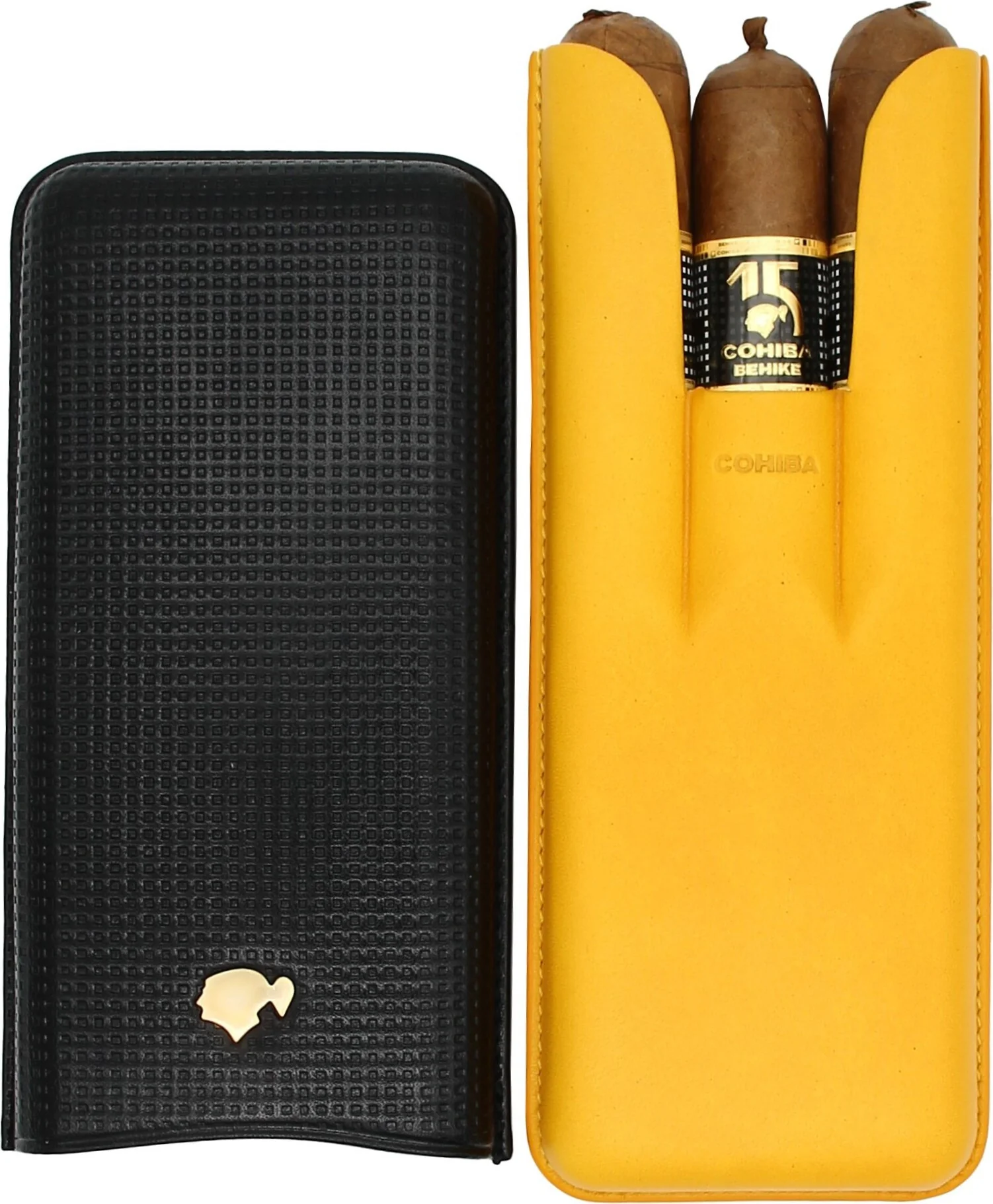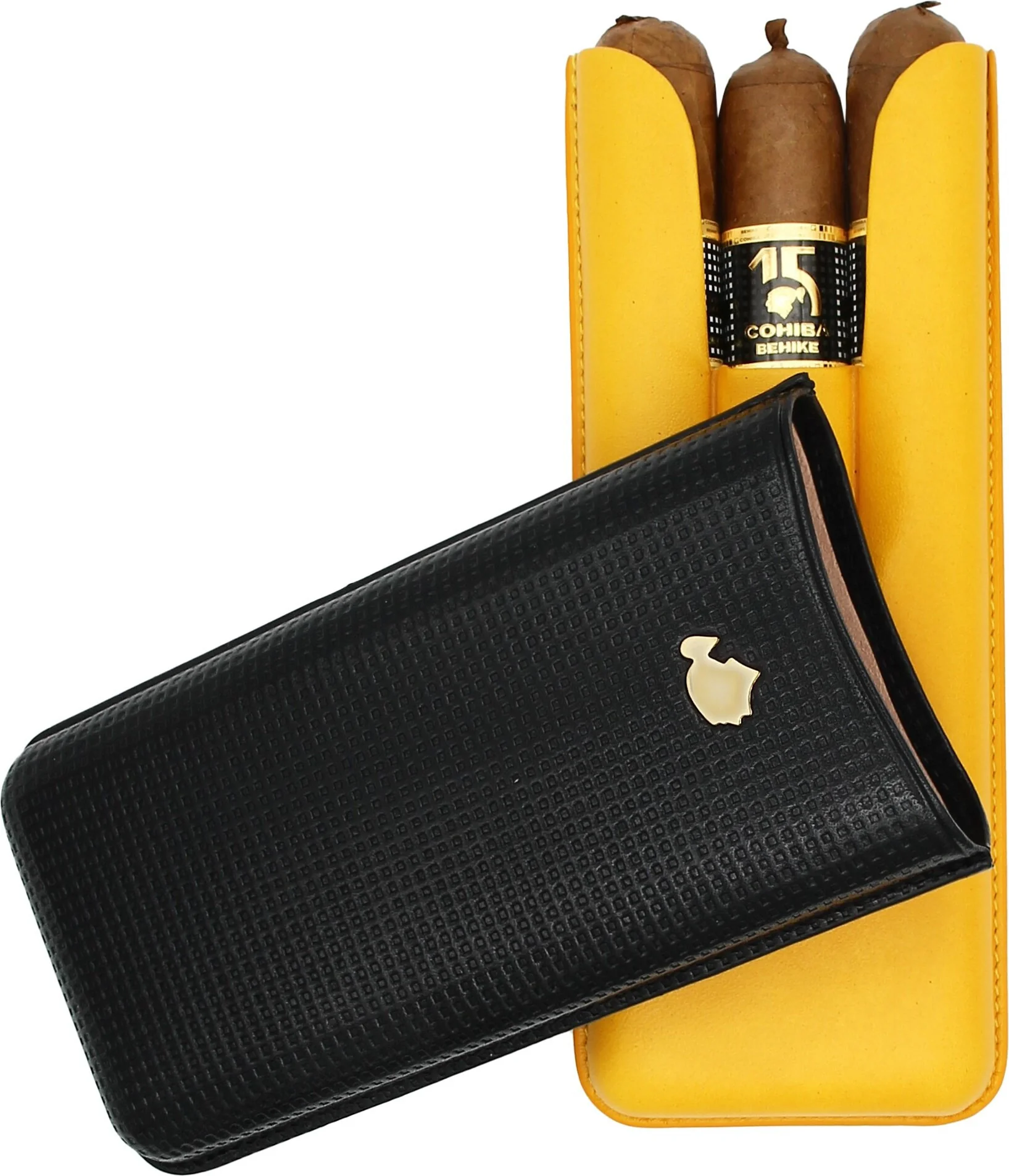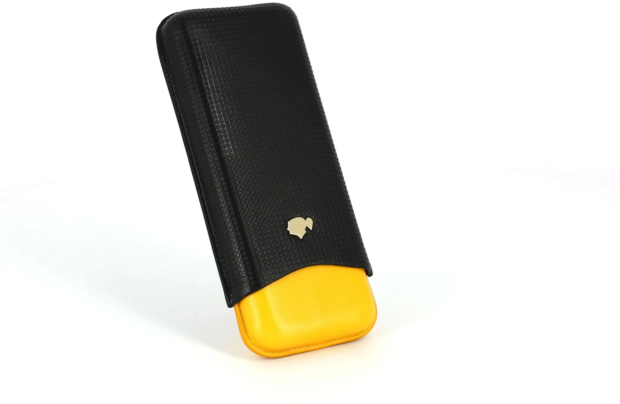 The striking genuine Spanish leather cigar case immediately catches the eye with its two-tone yellow and black colors, which those in the know will instantly recognize as an homage to the brand’s famous cigar band. The upper black portion of the case is decorated with a textured grid, fashioned after the Cohiba cigar band’s familiar square pattern. Cohiba’s iconic Taino silhouette in silver finishes it off with a touch of elegance.