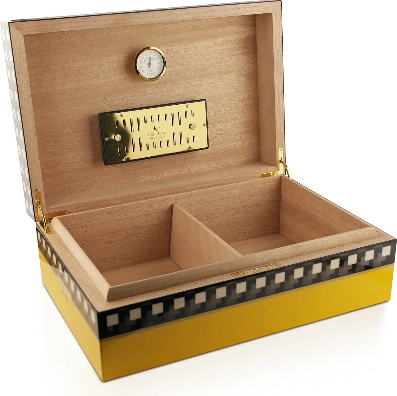 A hygrometer and a sponge-based humidifier are included. Both components are magnetically attached to the humidor's lid and are securely and precisely integrated.