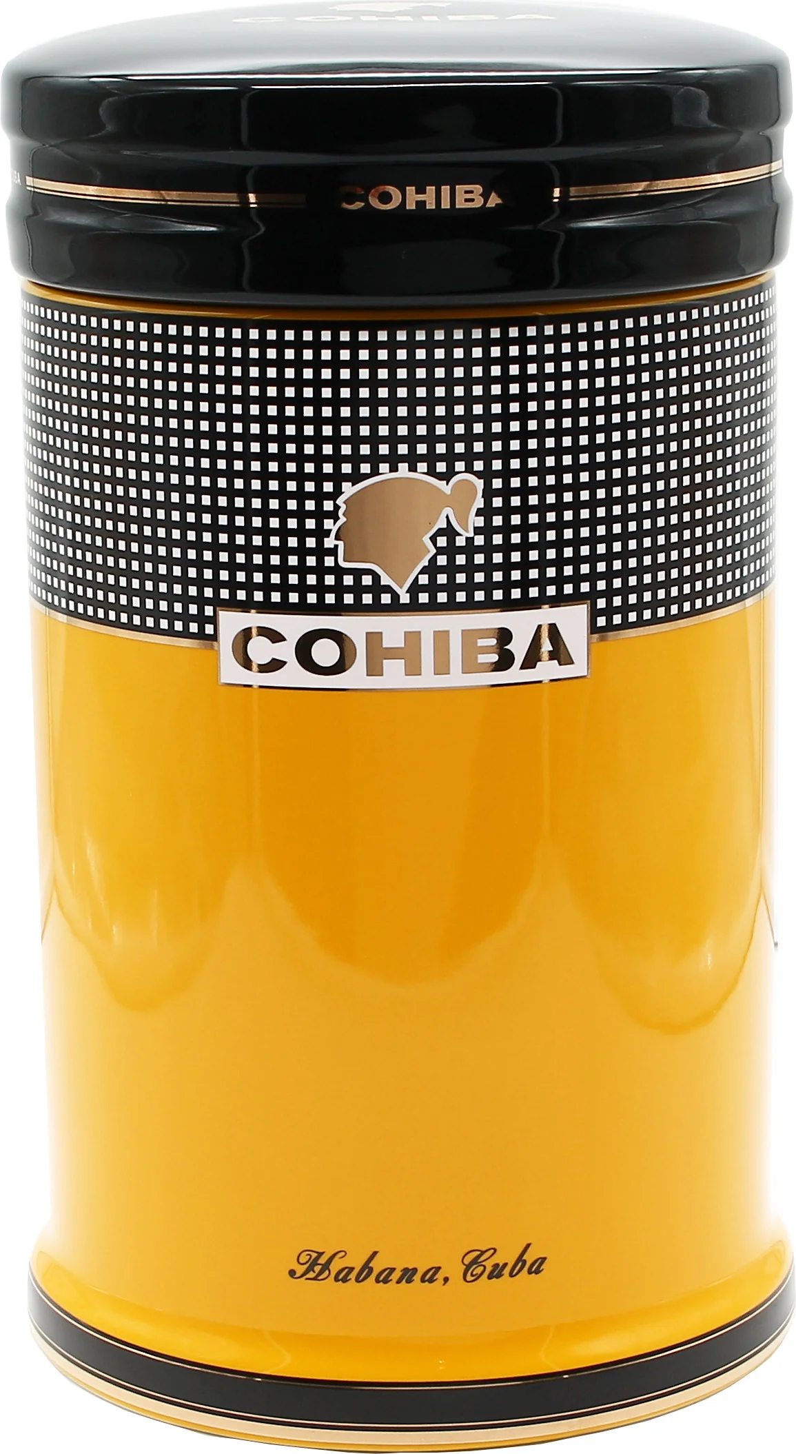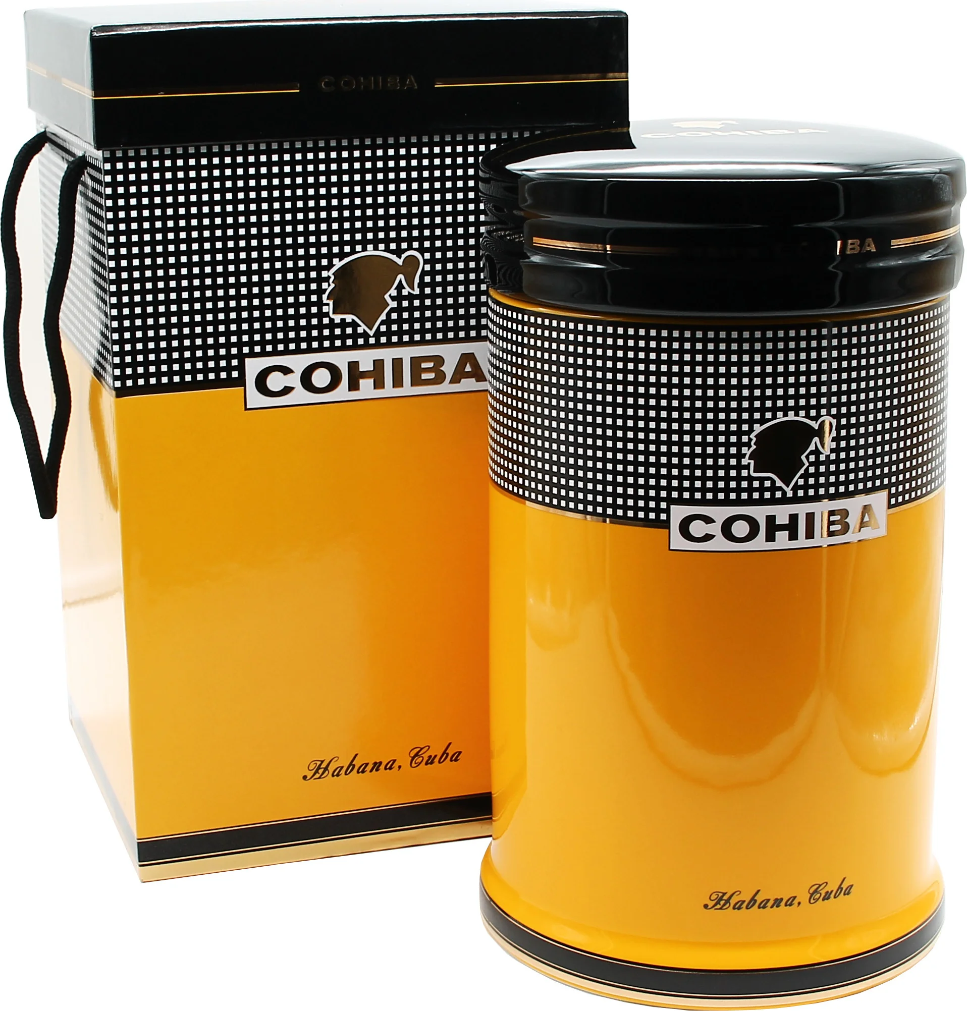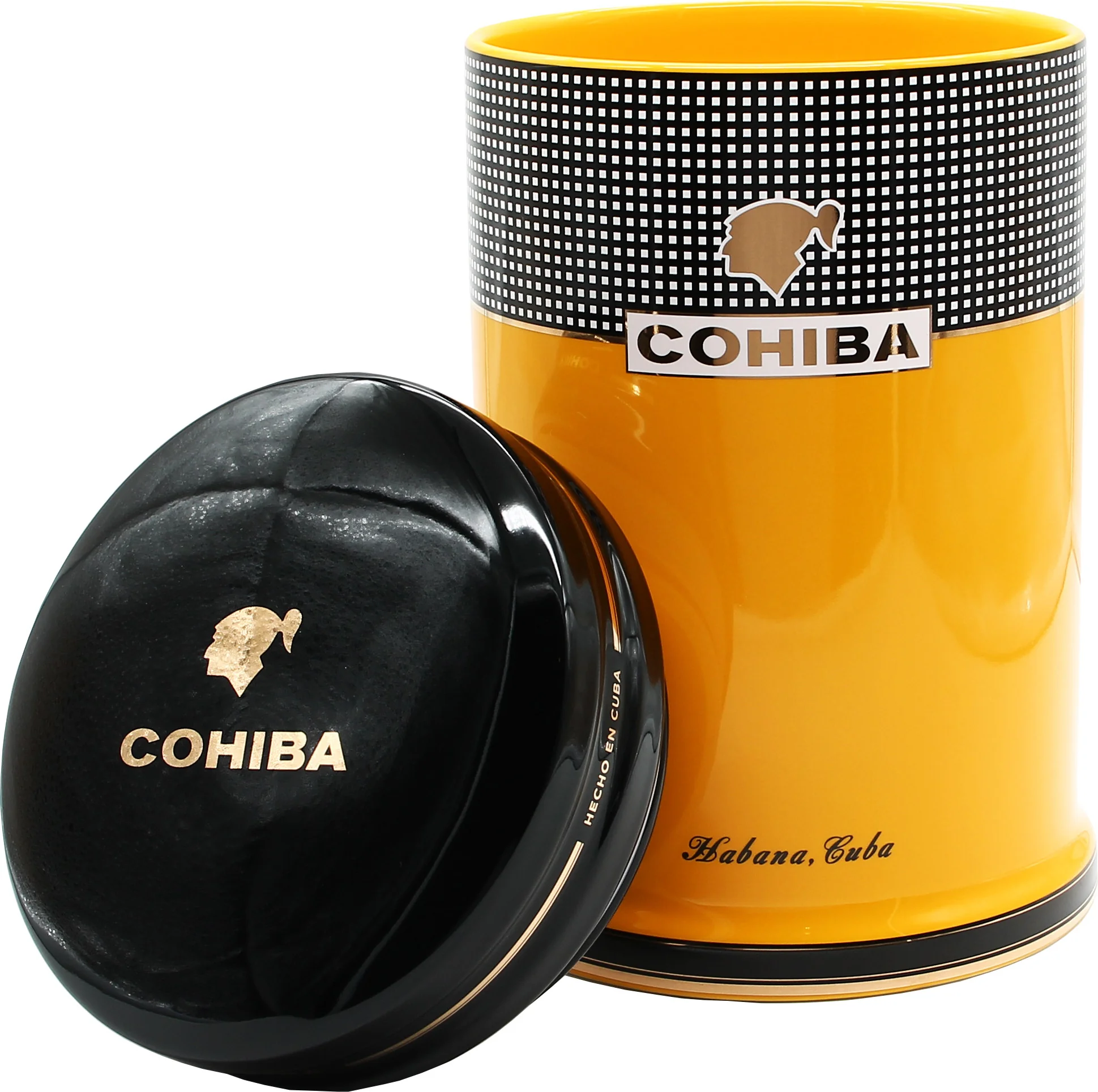 The Cohiba Porcelain Jar is a functional and attractively designed storage container from the renowned Cuban cigar brand Cohiba. It features the brand's signature colors of yellow, black, and white, complemented by subtle gold accents. The interplay of these elements ensures a clear recognition of the brand's style without being obtrusive.