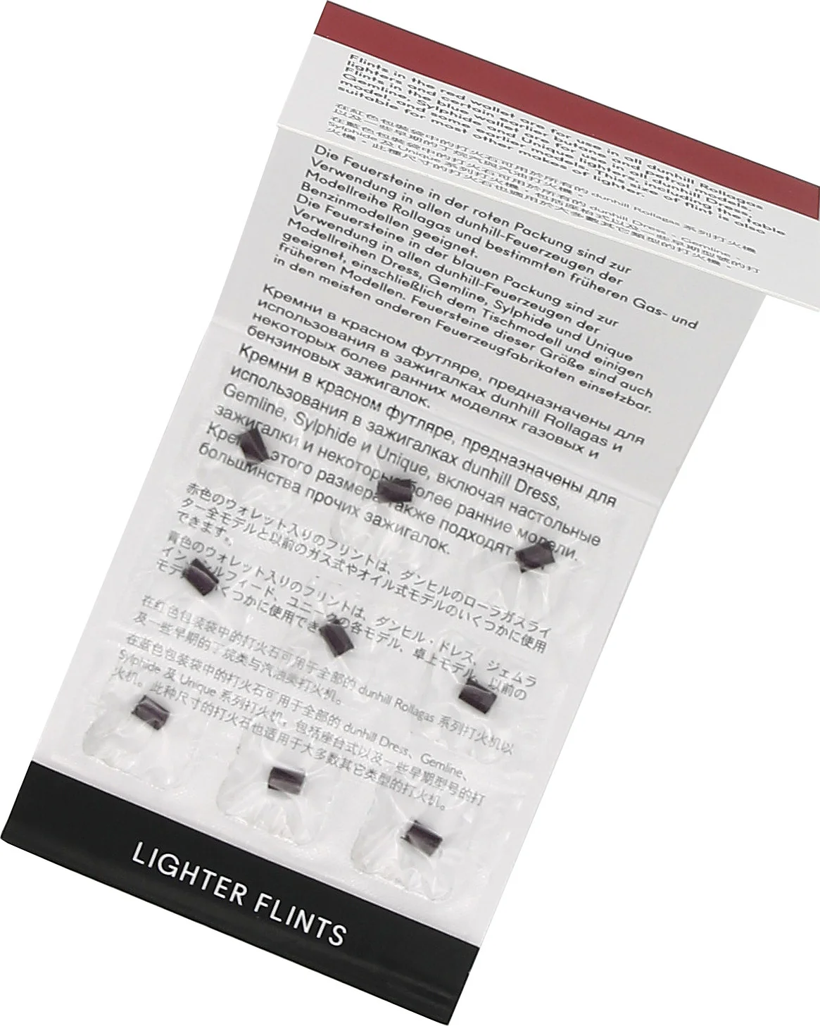 The Dunhill flints in size B (red) are specially designed for Dunhill lighters from the "Rollagas" line. One pack contains 9 high-quality flints that ensure reliable ignition and a long service life of your Dunhill lighter.