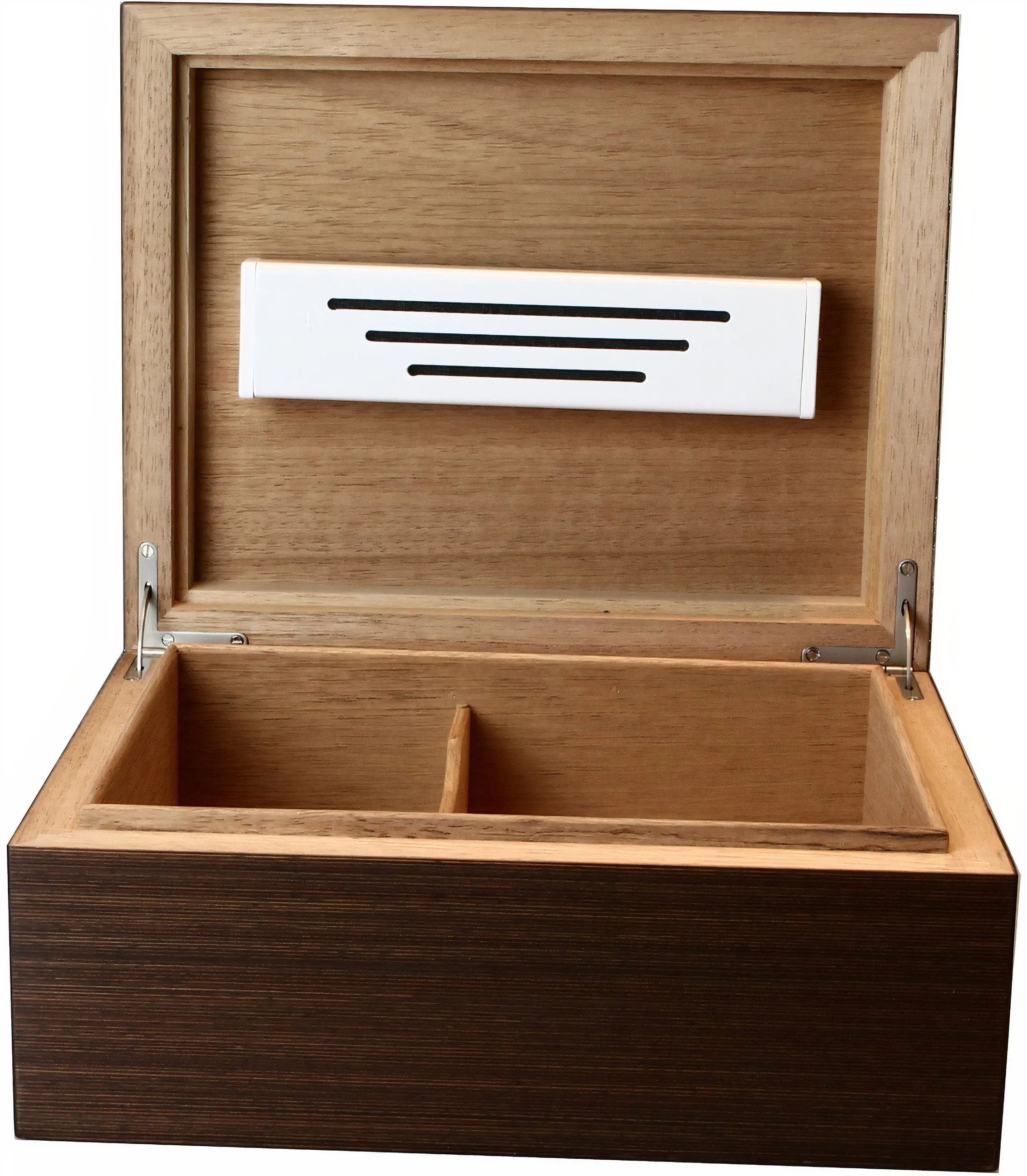 This beauty features wenge veneer, a dark and strong wood indigenous to Central Africa. A frosted lacquer finish complements the grain while adding a hint of modern style to the humidor. Spanish cedar lines the interior to give an ideal resting place for up to 50 Corona-size cigars. An included divider provides for better organization and premium quadrant hinges deliver a smoother lid action. These additional touches make the humidor an excellent choice.