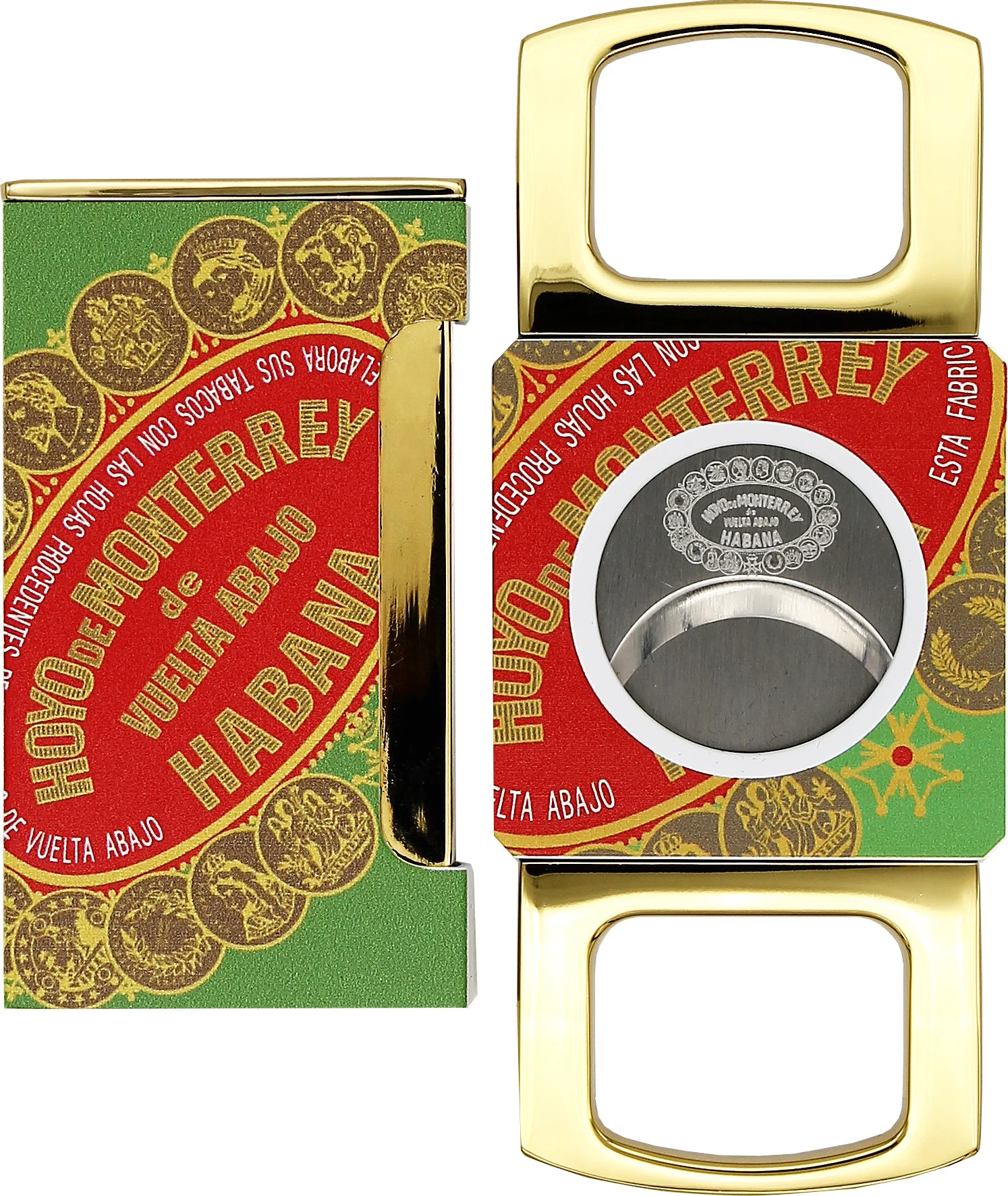 The green and red Hoyo de Monterrey designs are complemented by shining gold accents, giving both the lighter and cutter an exclusive appearance. The interplay of the brand colors, gold, and high-quality craftsmanship makes this set an elegant and modern companion for every cigar aficionado.