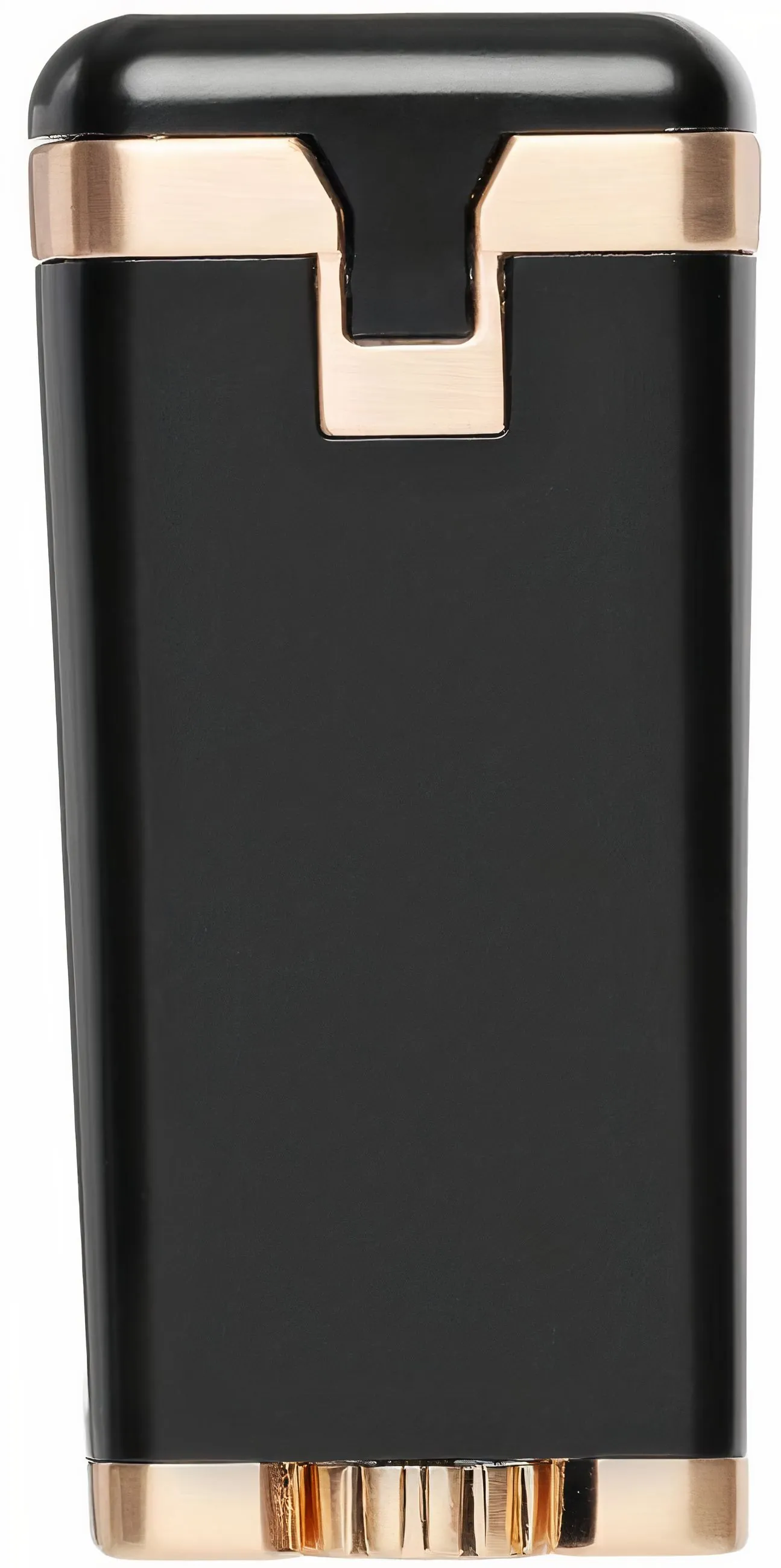 Palio Polaris Jet Lighter in Black and Rose Gold is a high-performance jet lighter with a sleek matte black finish and elegant rose gold accents. Featuring three powerful jet flames that merge into a reliable burner, this lighter offers consistent ignition for cigar enthusiasts. The ignition is shielded by a protective cap, keeping dust and lint away to ensure long-lasting performance. The Palio logo is prominently displayed on the front ignition switch, which ignites the lighter with a smooth downward slide. A large, transparent gas window on the left side allows for easy monitoring of the fuel level. Naturally, the lighter is refillable, and the flame intensity can be conveniently adjusted by hand at the base of the lighter without additional tools.