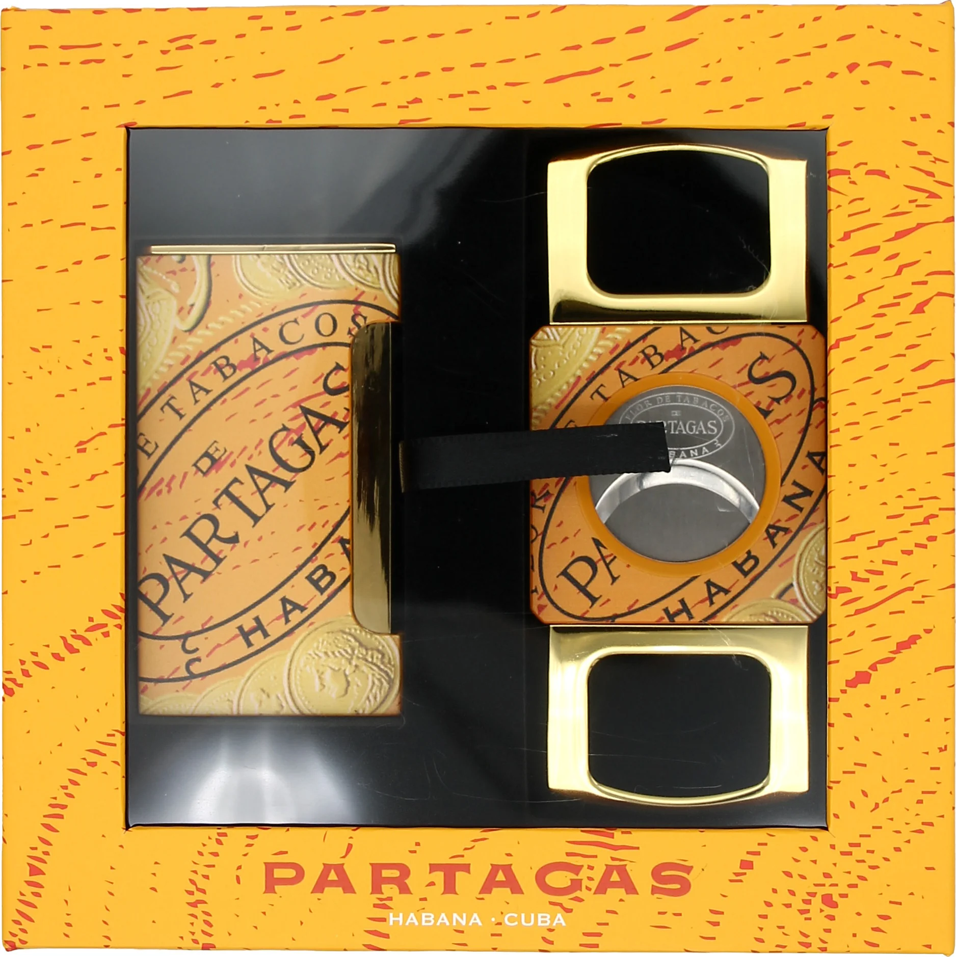 This Partagás lighter and cigar cutter set combines two high-quality accessories from the renowned Cuban cigar brand Partagás. Both pieces of the set feature the distinctive Partagás logo in vibrant orange and the brand's signature design motif on both sides, creating a distinctive and iconic look. The orange Partagás logo is complemented by shining gold accents, giving both the lighter and cutter an exclusive appearance. The interplay of vibrant orange, gold, and high-quality craftsmanship makes this set an elegant and modern companion for every cigar aficionado. The lighter is a single-flame jet lighter, ideal for precisely lighting cigars. It is refillable, and the flame intensity can be adjusted using the plus/minus control on the base. The double-blade cigar cutter has angled stainless steel blades that allow for a clean and reliable cut of the cigar. One of the blades is additionally laser-engraved with the Partagás logo, further emphasizing the high-quality overall impression.