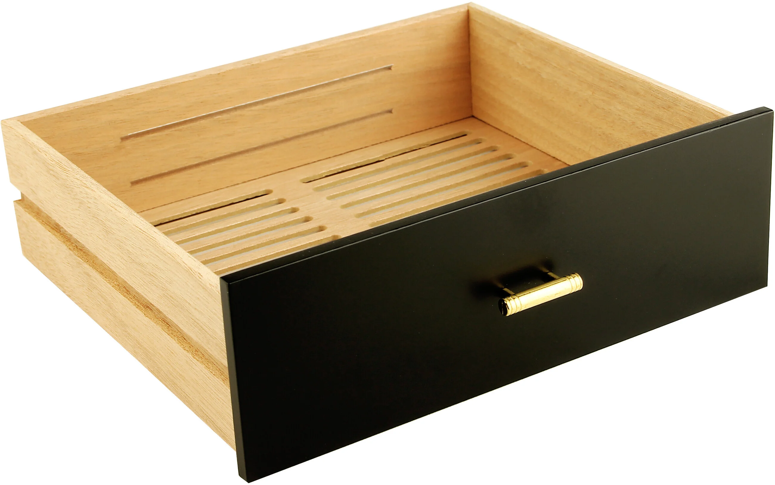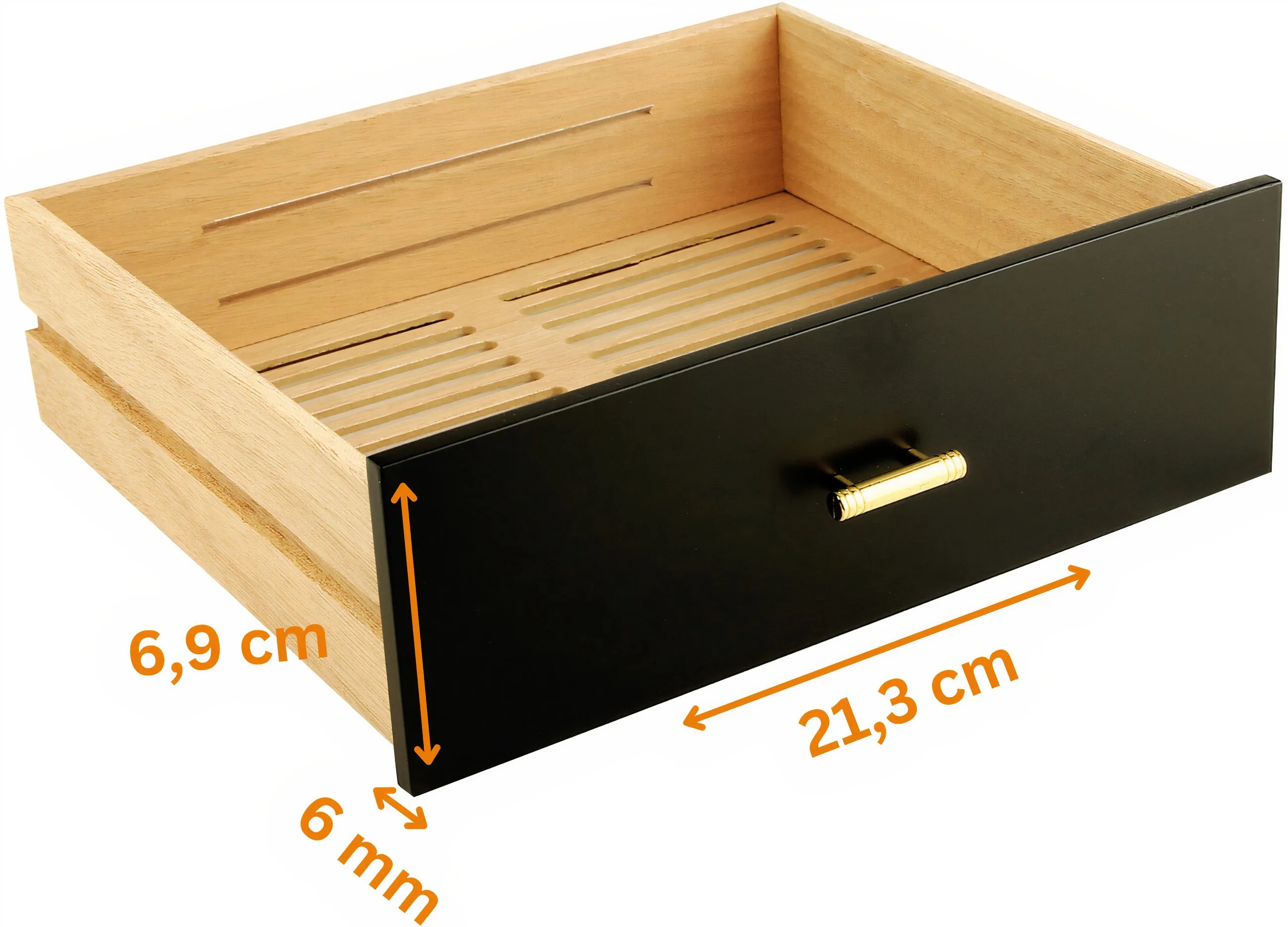 Replacement Drawer for adorini Chianti Medium Deluxe Humidor Renew your adorini Chianti Medium Deluxe Humidor with our high-quality replacement drawer. This drawer features an elegant black front that adds a timeless aesthetic to your humidor. The drawer's casing is made of aromatic Spanish cedar wood, renowned for optimal cigar storage conditions. The golden handle on the drawer is not only functional but also adds a touch of luxury to the entire humidor. The contrast between the black front panel and the golden handle creates an appealing visual appearance. The drawer is equipped with ventilation grooves, ensuring optimal air circulation to help maintain your cigars in perfect condition. The ventilation grooves facilitate even distribution of humidity within the humidor, creating an ideal climate for the maturation of your cigars. With this replacement drawer, you can not only preserve the functionality of your adorini Chianti Medium Deluxe Humidor but also customize the appearance according to your preferences. Enjoy the precision craftsmanship, high-quality materials, and thoughtful design of this replacement drawer, which provides a perfectly conditioned space for storing your cigars.