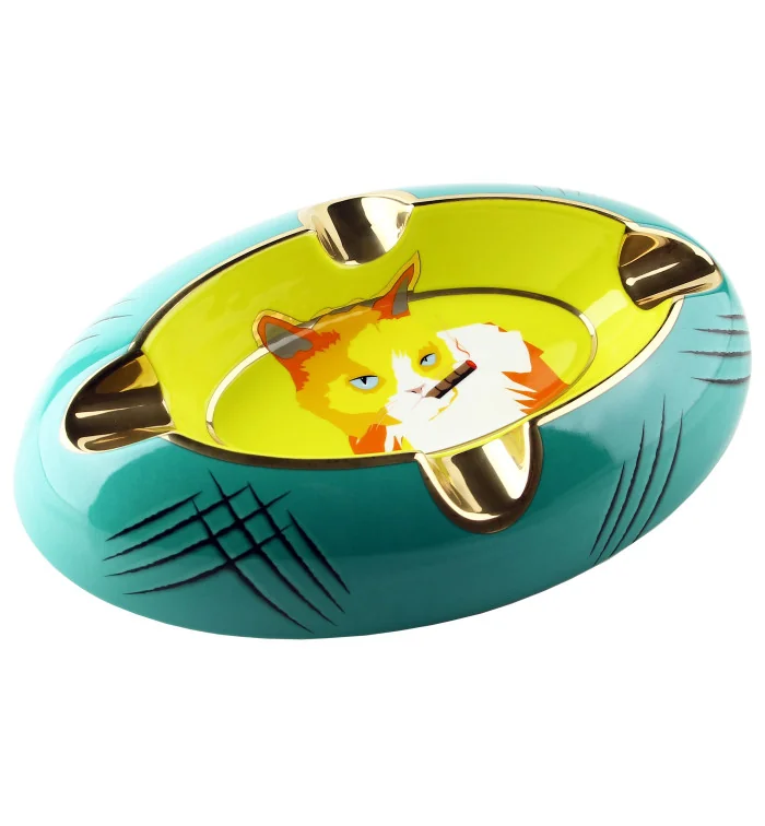Siglo Cat Ashtray in Yellow/Green is a striking cigar ashtray in Siglo's iconic pop art style. This ashtray makes a bold statement with its vibrant color mix of turquoise-green and yellow, along with the unique image of a cigar-smoking cat. Four generously sized cigar rests ensure that cigars are held securely and suspended freely – perfect for those who enjoy their cigars in company.