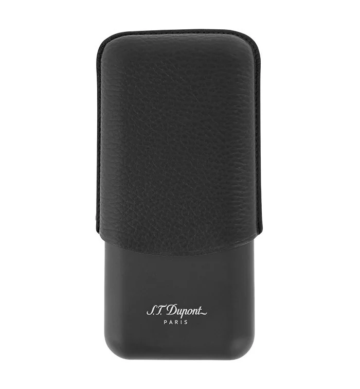 S.T. Dupont cigar case for 3 cigars, matt black The S.T. Dupont cigar case for 3 cigars in matt black is an elegant and modern-looking cigar case from the French luxury brand S.T. Dupont. The upper part is made of high-quality dyed cowhide that was processed in Spain and is embossed with "Made in Spain" on the inside. The leather has a decorative seam on the outside that underlines the elegant overall look of the cigar case. The lower part of the case is made of metal, which is ideal for transporting three cigars as it is pressure and break-resistant. A special feature is the notch in the upper part of the metal lower part, which prevents the cigars or a single cigar remaining in the case from rolling back and forth. The diameter of the stainless steel case is 2.45 cm and therefore holds two cigars with a maximum ring gauge of 61. The length of the case is variable from approximately 160 mm to approximately 220 mm when completely retracted. The item is delivered in representative packaging, which makes it ideal as a gift. Make a confident and modern-sporty aficionado happy with this faithful companion. A guarantee card and care instructions from Dupont are included in the case. Design, materials and special features: