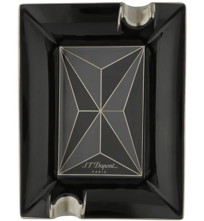 S.T. Dupont Fire X Ashtray Black is an elegant cigar ashtray from the French luxury goods manufacturer S.T. Dupont, featuring an impressive size. Made of porcelain, it has two cigar rests. The Fire X motif, part of the newly launched 2024 collection from Dupont, adorns the interior of the ashtray with a modern graphic in grey, black, and silver decor. The brand logo is also incorporated into the design. The two cigar rests are silver lacquered. The product comes in an attractive gift box.
