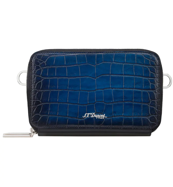 The S.T. Dupont Le Grand Atelier Cigar Crossbody Bag in blue is a stylish accessory for cigar smokers. Made from calf leather embossed with a crocodile pattern, this small shoulder bag offers an elegant and practical solution for transporting your cigars and accessories. The bag is ideal for carrying a 3-cigar case from S.T. Dupont along with related accessories.