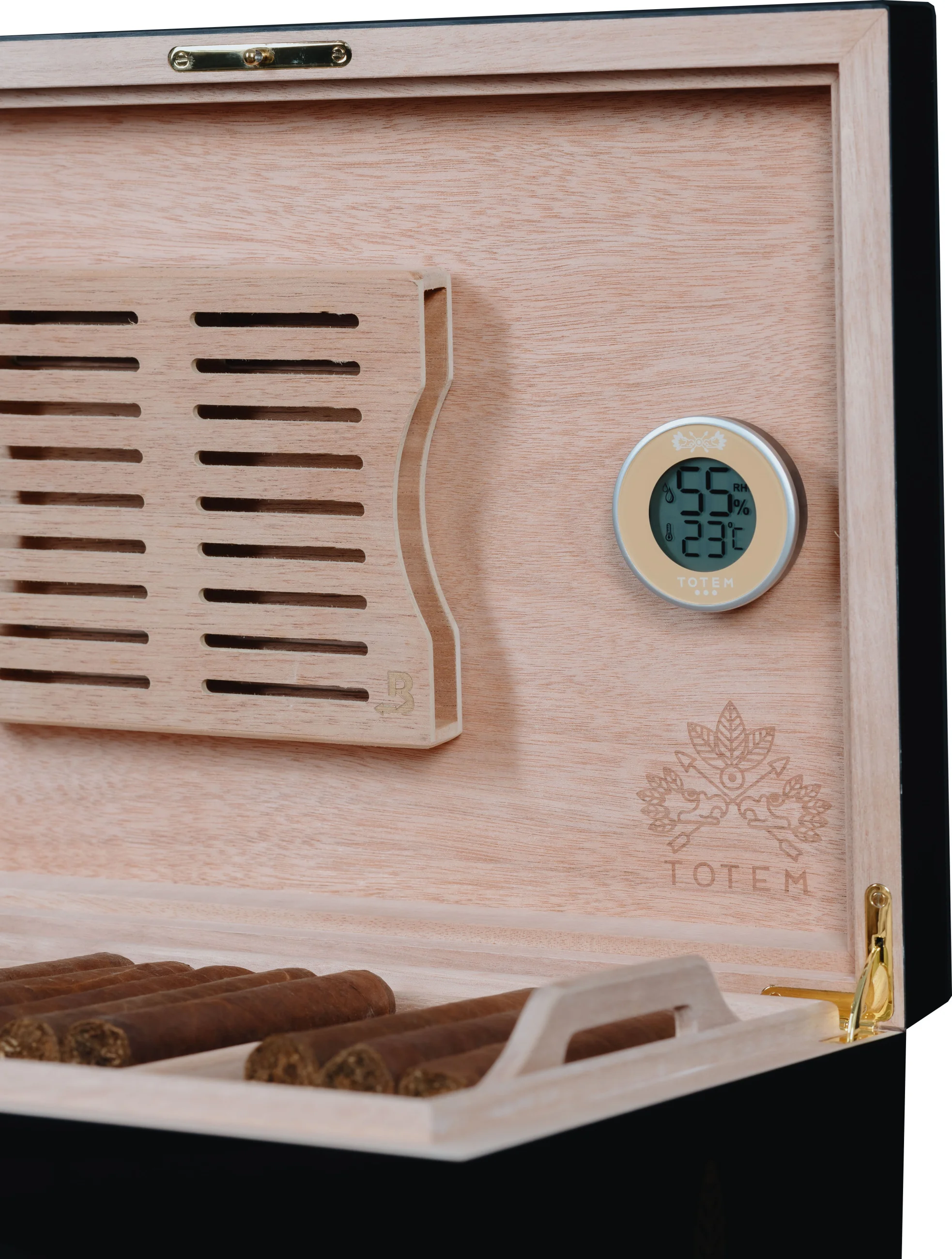This digital hygro-thermometer can serve as a valuable replacement part for Totem humidor owners or can be installed in humidors from other brands. It displays the current relative humidity and temperature, which are important indicators of the climate inside your humidor. Its round shape and space-saving design fit into even the smallest humidors without sacrificing any volume. It is made of metal and plastic and is powered by a CR2032 button cell battery, which is included.